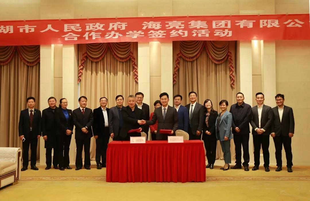 12月28日,海亮集團與蕪湖市人民政府合作辦學簽約儀式在蕪湖市舉行。蕪湖市長賀懋燮、副市長程剛、安徽省江北產業集中區管委會主任唐開強及有關部門負責人,海亮集團、教育管理集團、教育投資集團有關領導馮亞麗、陳軍偉、潘利民、辛穎等參加簽約儀式。